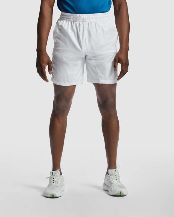 Pantaloncini sportivi con tasche laterali. Girovita elastico con cordoncino per regolazione. Tessuto leggero e traspirante con interno in maglia di microfibra.