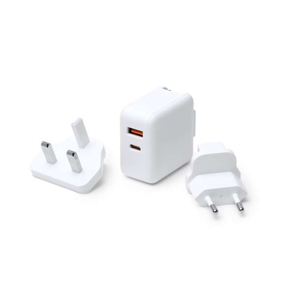Adattatore da viaggio universale con connettori intercambiabili. Valido per l'uso in Europa, Regno Unito, Asia, Stati Uniti e Australia. Con uscita 3A USB e Tipo C.