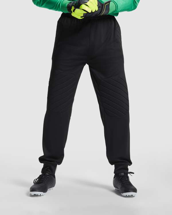 Pantalone lungo da portiere unisex.1. Con inserti laterali imbottiti e ginocchiere.2. Girovita elastico con cordoncino interno regolabile.3. Parte inferiore con elastico.