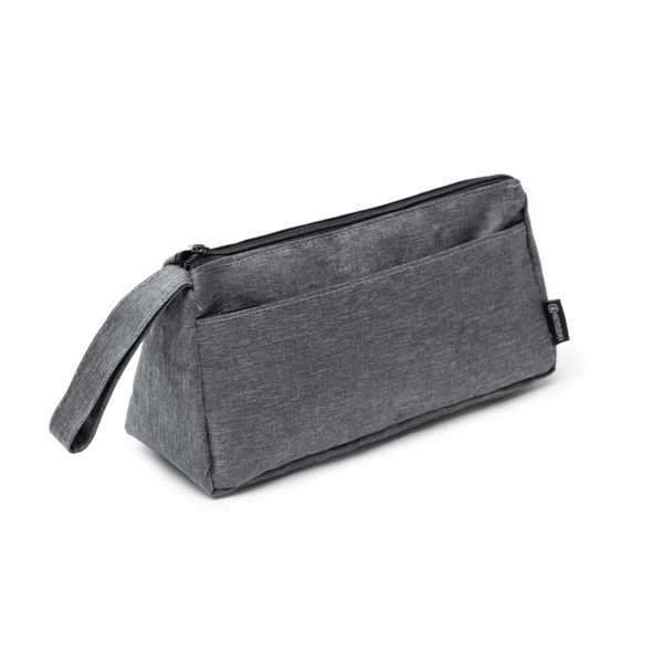 Borsa da toilette in poliestere riciclato RPET con dettagli in pelle PU, ideale per la stampa. Include una maniglia per il trasporto, che unisce sostenibilità e stile. Portate con voi i vostri effetti personali in modo comodo ed elegante.