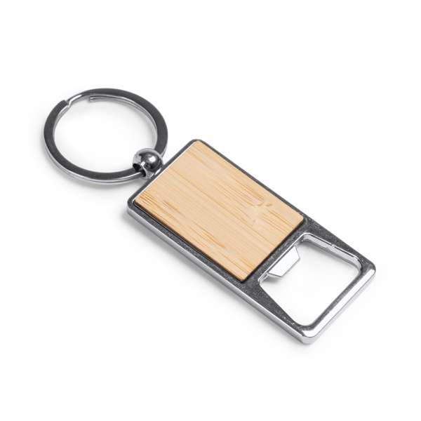 Portachiavi apribottiglie in bambù e metallo cromato.