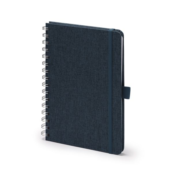 Quaderno A5 con copertina rigida in tessuto poliestere riciclato RPET e doppia spirale. Include un elastico di chiusura e un portapenne in tinta con la copertina. Contiene 80 fogli foderati, perfetti per appunti organizzati ed ecologici.