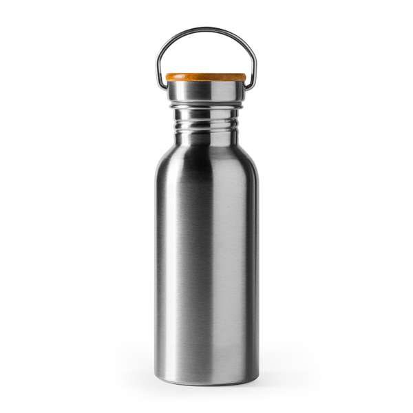 Bottiglia in acciaio inox 304 e bambù. Bianco speciale da marcare in sublimazione. Capacità 620 ml. Da personalizzare a piacimento, come regalo per i vostri clienti.