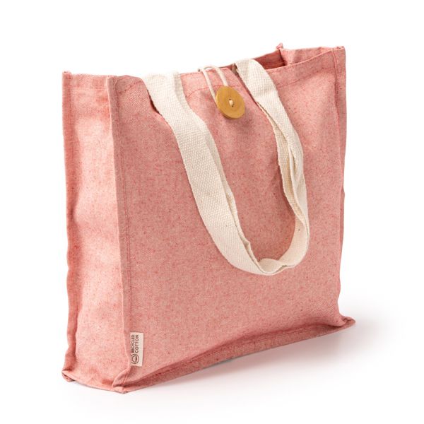 Borsa in cotone riciclato con finitura mélange. Manici rinforzati lunghi 70 cm. Chiusura a bottoni.