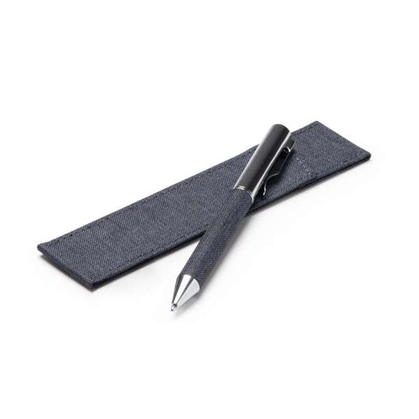 Penna a sfera con meccanismo a rotazione in metallo e poliestere RPET. Inchiostro blu. Confezione in astuccio di poliestere RPET abbinato.