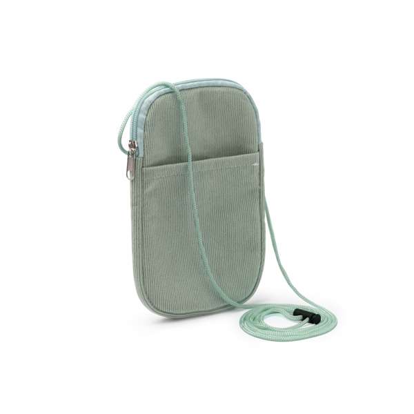 Porta cellulare realizzato in velluto a coste. Scomparto principale con chiusura a zip in tinta. Tasca esterna. Include una tracolla abbinata.