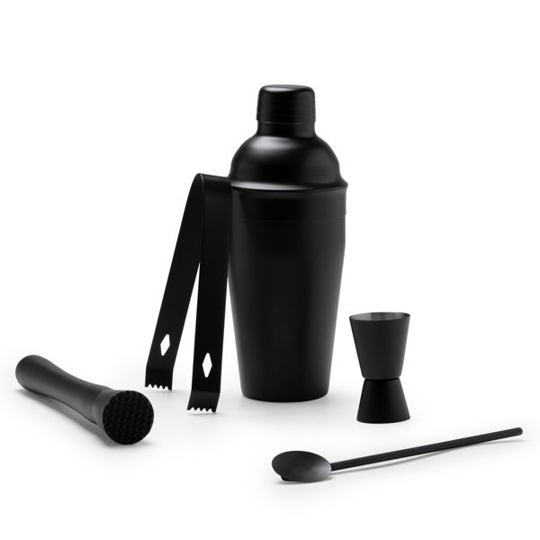 Set da cocktail in acciaio inox 304. Include misurino, shaker da 580 ml, colino e cucchiaio. Borsa da trasporto inclusa.