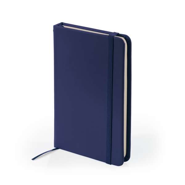 Blocco note formato A6 con copertina rigida in similpelle. Chiusura elastica e segnapagina coordinati. 100 pagine.