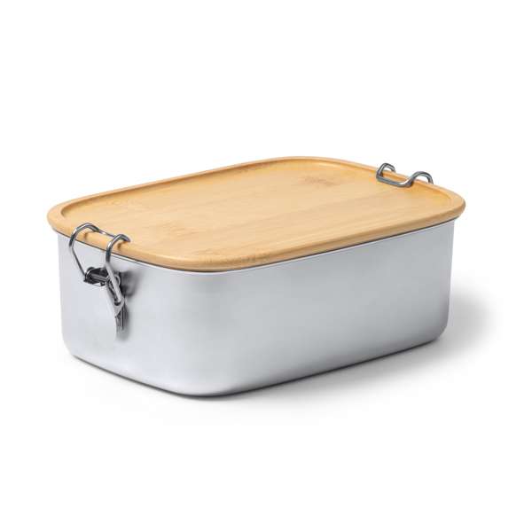 Contenitore per il pranzo in acciaio inox 304 con coperchio in bambù. Sistema di chiusura con fibbie laterali. Ampia capacità di 1 litro per conservare gli alimenti. Contenitore per il pranzo personalizzabile.