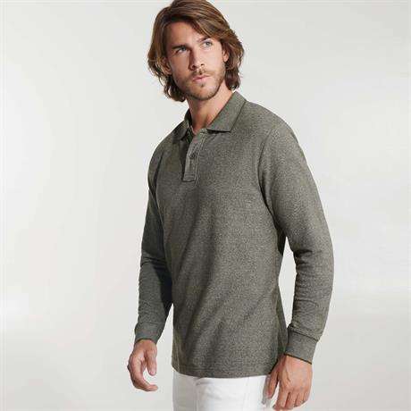 Polo vigoré manica lunga, con abbottonatura sovrapposta a 2 bottoni in tinta. Collo e polsini con colori solidi. Copri cuciture rinforzate all'interno del collo. Spacchetti laterali con nastro decorativo a contrasto. La parte posteriore è leggermente più lunga della parte anteriore.