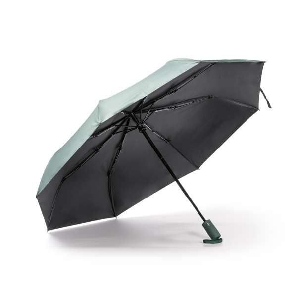 Ombrello pieghevole realizzato in RPET con protezione contro i raggi ultravioletti. Apertura e chiusura automatica. Tessuto pongee 190T con protezione UV SPF50. Stecche in fibra di vetro con protezione contro i temporali. Chiusura in velcro. Include una fodera abbinata.