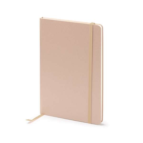 Blocco note formato A5 con copertina rigida realizzata con scarti di frutta. Include segnalibro ed elastico coordinati. All'interno 80 fogli foderati, ideali per prendere appunti con un tocco ecologico e originale.