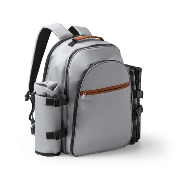 Zaino da picnic in poliestere RPET. Scomparto principale comprendente: 2 tazze, 2 piatti, 2 set di posate. Uno scomparto laterale per la coperta da picnic (inclusa) e uno scomparto laterale per le bottiglie.