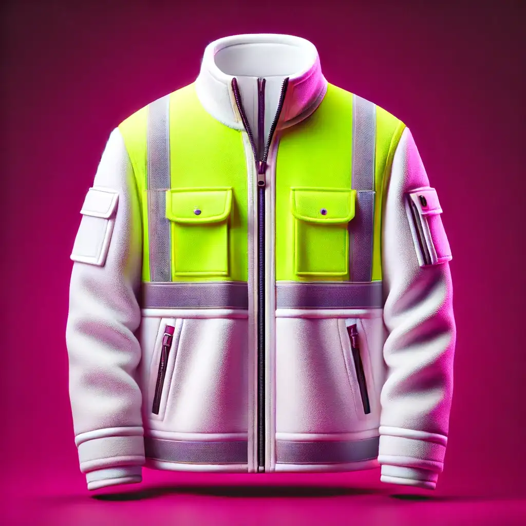 Giacca in pile ad alta visibilità. · Cerniera anteriore con protettore per il mento.· Due striscie riflettenti orizzontali sul torso e maniche. · Due tasche anteriori con cerniera in tinta e una tasca sul petto. · Polsini elastici e regolatori all'interno nel girovita.