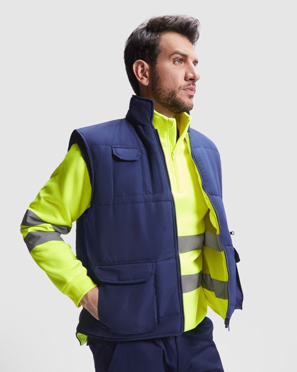 Gilet multitasche ad alta visibilità.· Due fasce catarinfrangenti sul petto.· Scollo a V e zip in nylon.· Tasca superiore sul lato destro del petto, con occhiello in metallo. · Due tasche sul petto con soffietto, patta e chiusura a strappo. · Due tasche laterali con soffietto e chiusura a zip con due tasche sovrapposte con patta e chiusura a strappo. · Due fasce retroriflettenti in vita e sul retro. · Due tasche sul retro con patta e velcro.· Modello rifinito in sbieco.