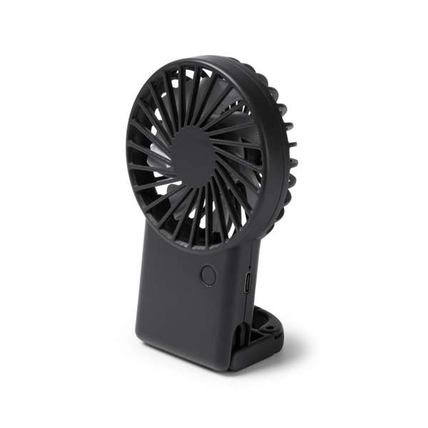 Ventilatore portatile con moschettone e supporto. Tre velocità. Realizzato in ABS riciclato. Include cavo di tipo C. Confezione in scatola con design ecologico