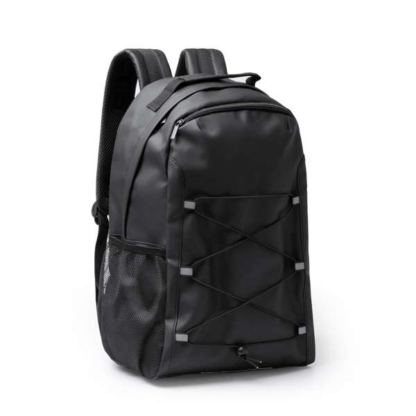 Zaino realizzato in pelle PU con dettagli riflettenti. Scomparto principale di grandi dimensioni con tasca interna per laptop da 17". Parte anteriore con cordoncini elastici e tasca laterale. Maniglie regolabili. Schienale e manici imbottiti. Misura: XL