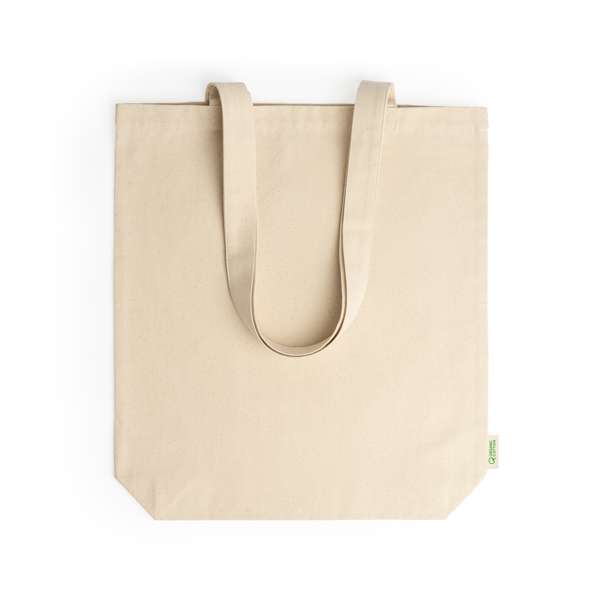 Borsa 100% cotone biologico 280 g/m² con soffietto e pratici manici lunghi 70 cm.