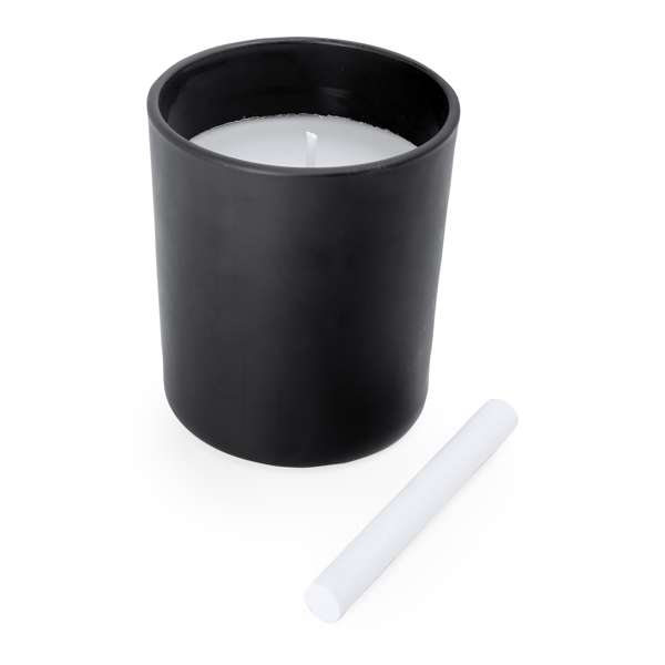 Candela profumata in un contenitore rotondo di ceramica nera. Include un gessetto per scrivere sul contenitore. Candela e stoppino bianchi. Profumo di vaniglia.