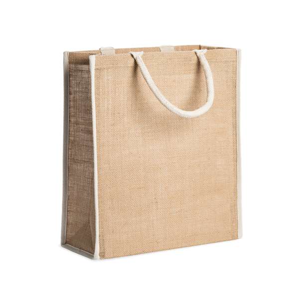 Borsa in juta naturale con bordino in cotone e manici rinforzati. Finitura cucita.