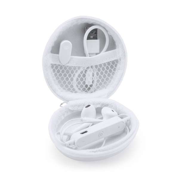 Cuffie wireless con pannello di controllo e microfono incorporato. Suono stereo. Contenute in una pratica custodia in similpelle con cerniera. Batteria ricaricabile e cavo inclusi.