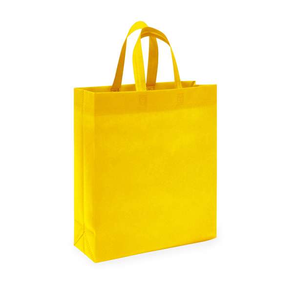 Borsa termosaldata con soffietto nei laterali e alla base, realizzata in tessuto no woven (TNT), con manici corti a nastro dello stesso colore.