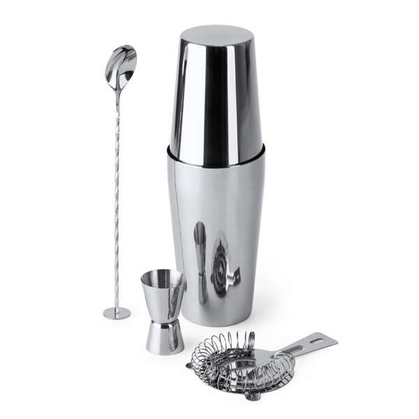 Set da cocktail in acciaio inox 304. Include misurino, shaker da 580 ml, colino e cucchiaio. Borsa da trasporto inclusa.