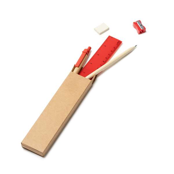 Set scrittura 5 pezzi custoditi in scatola di cartone kraft. Include penna con corpo in cartone e refil blu, matita in legno, temperamatite, gomma e righello da 15 cm.