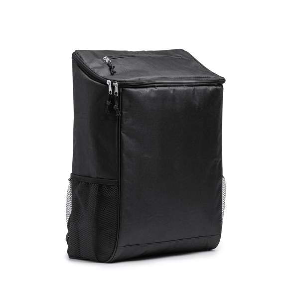 Zaino termico in RPET. Fodera isotermica nello scomparto principale e tasca nella patta. Tasche laterali a rete. Capacità 18 litri. Schienale e spallacci imbottiti.