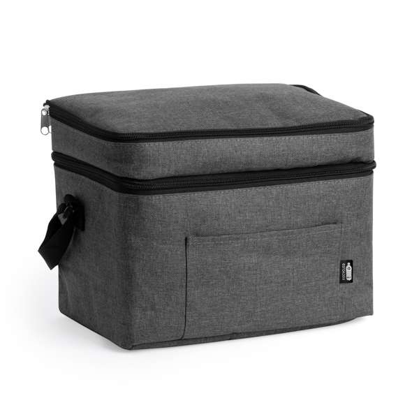 Nevera XL de poliéster reciclado RPET con diseño vigoré. Doble compartimento y bolsillo frontal. Interior isométrico. Más capacidad para llevar la comida y bebida de manera más cómoda.