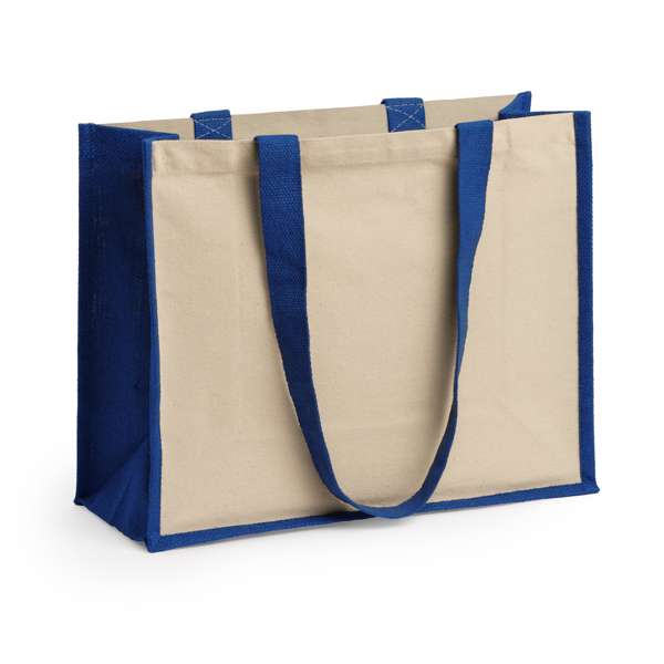 Borsa in juta laminata con un lato in cotone ideale per la stampa e manici lunghi.