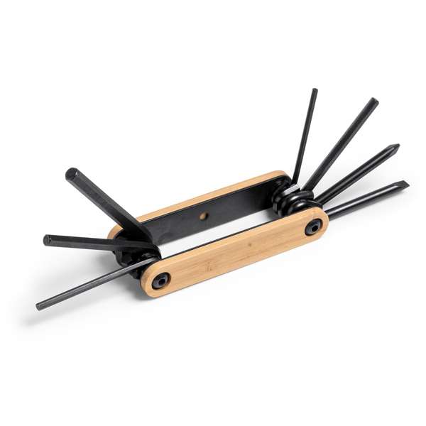Utensile multifunzione con accessori in acciaio inox. Confezione in scatola di design ecologico.