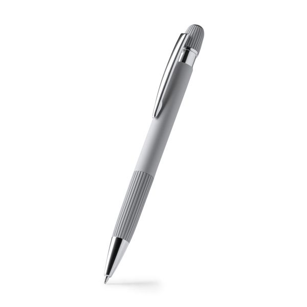 Penna a sfera in alluminio con impugnatura a righe in finitura metallizzata e puntatore touch. Ricarica jumbo inchiostro blu.
