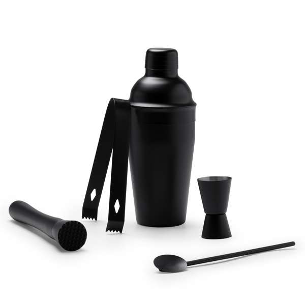 Set da cocktail in acciaio inox 304 con misurino, shaker da 550 ml, pinze, cucchiaio e pestello. Confezione in scatola di design.