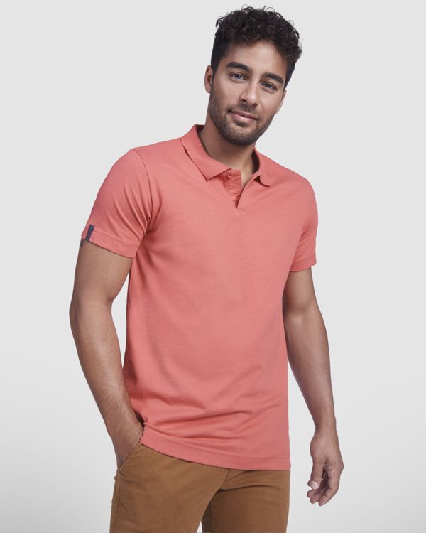 Polo a maniche corte in tessuto a maglia tinta unita. Colletto e bordi delle maniche in costina 1x1. Abbottonatura a 1 bottone. Copri cuciture rinforzate sul colletto. Spacchi laterali sull'orlo. Nastro a spina di pesce a contrasto su polsini e colletto. Logo Roly in rilievo dello stesso colore della base del tessuto.