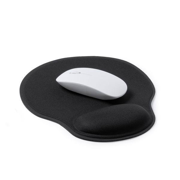 Tappetino per mouse in morbido poliestere con poggiapolso imbottito. Base in gomma antiscivolo. Il design di questo tappetino consente di riposare i polsi mentre si lavora.