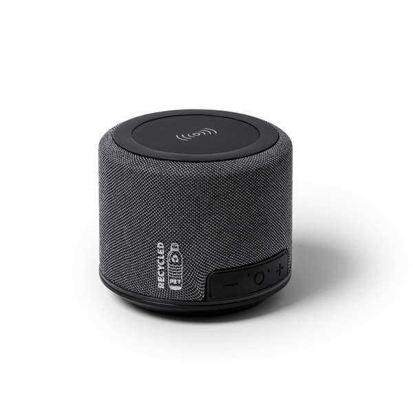 Cassa wireless in tessuto RPET con sistema di aggancio wireless da 5W. Uscita 3W. Connessione di tipo C. Cavo incluso. Confezione in scatola dal design ecologico.