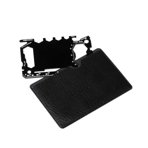 Utensile multifunzione in acciaio inox con 17 funzioni integrate. Strumento versatile che comprende: un apriscatole, un coltello affilato, un cacciavite, un righello, un apribottiglie, una chiave regolabile, una chiave a farfalla, una sega, un indicatore di direzione e un trasportatore angolare. Confezione in custodia PU.