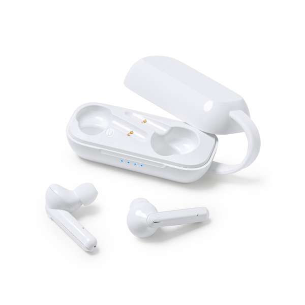 Cuffie wireless Bluetooth 5.0 con custodia di ricarica. Sono molto facili da usare grazie al pulsante multifunzione integrato in entrambe le cuffie. Funzione vivavoce e batteria ricaricabile tramite tecnologia wireless. Cavo incluso.