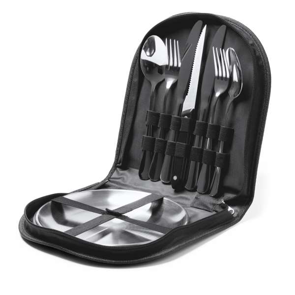 Set di posate e piatti in acciaio inox. Accessori: 2 cucchiai, 2 forchette, 2 coltelli, coltello a sega e 2 piatti. Custodia in RPET per il trasporto con chiusura a cerniera.