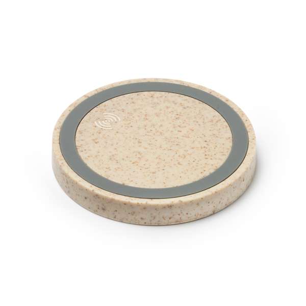 Base di ricarica wireless in fibra di grano, con potenza di 5W. Compatibile con i dispositivi dotati di tecnologia di ricarica wireless. Include cavo micro USB.