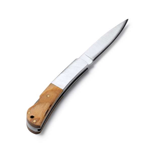 Coltello a serramanico in acciaio inox e impugnatura combinata con legno naturale. Chiusura di sicurezza. Confezione in scatola dal design ecologico.