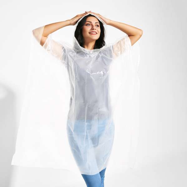 k-way per la pioggia compostabile. Trasparente e in taglia unica per adulti, con cappuccio e apertura per le braccia.