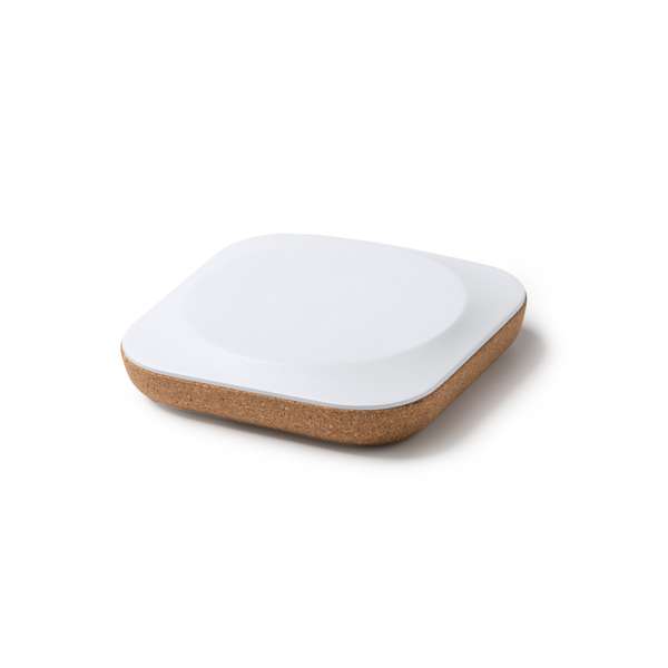 Caricatore wireless con struttura in ABS riciclato e sughero naturale. Carica rapida da 10 W. Connessione di tipo C. Cavo incluso. Confezione in scatola dal design ecologico.
